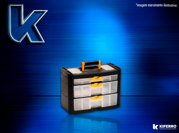 Possui alça para transporte, 3 gavetas e 2 compartimentos externos.